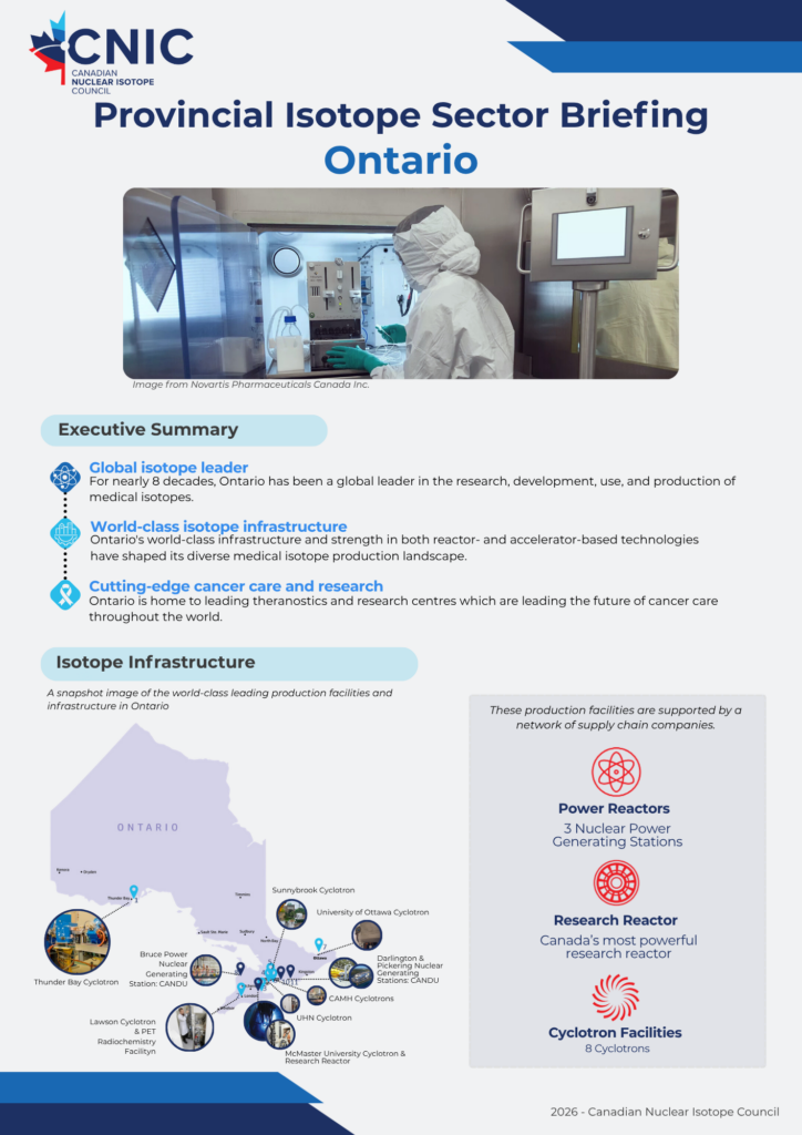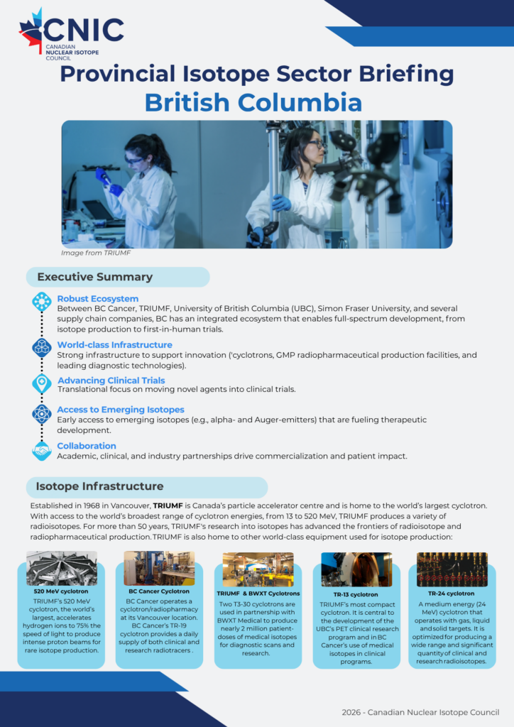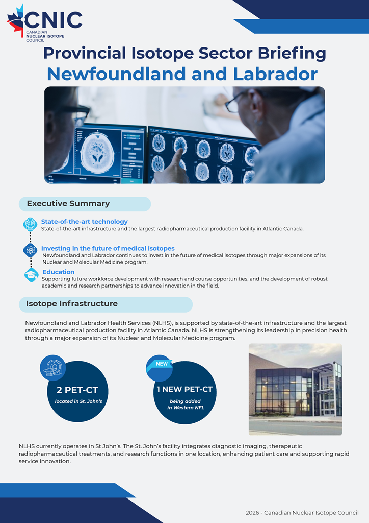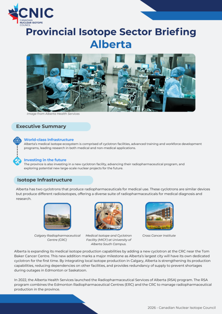We’re glad to showcase the innovation powering Canada’s isotope ecosystem from coast to coast. These educational resources, developed in partnership with industry, academic, and clinical leaders across the country, provide a detailed overview of the isotope ecosystem within each of Canada’s provinces. Click each page below to open the full briefing.