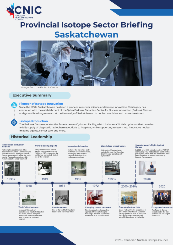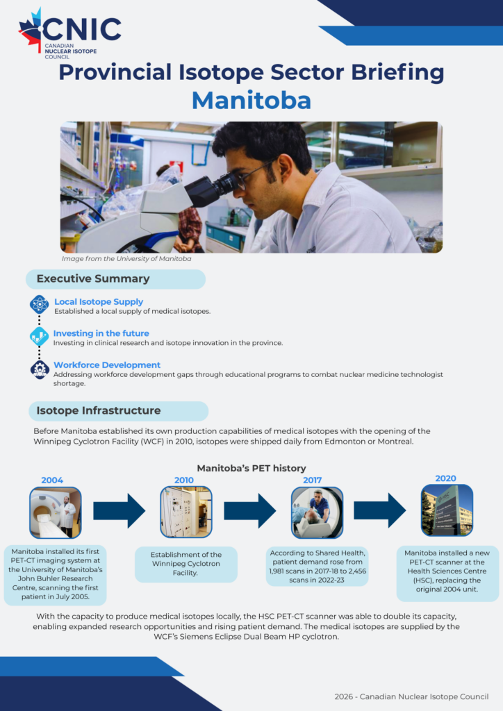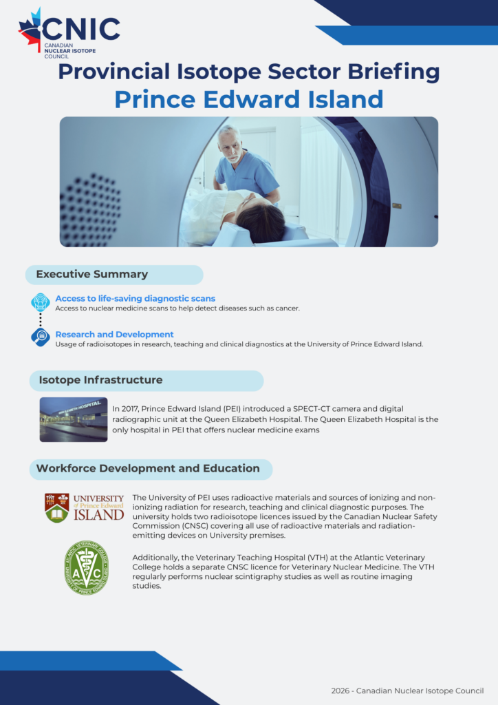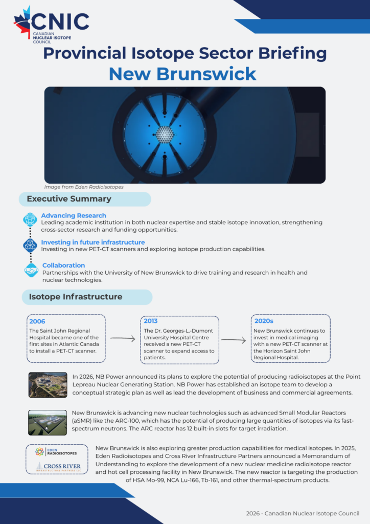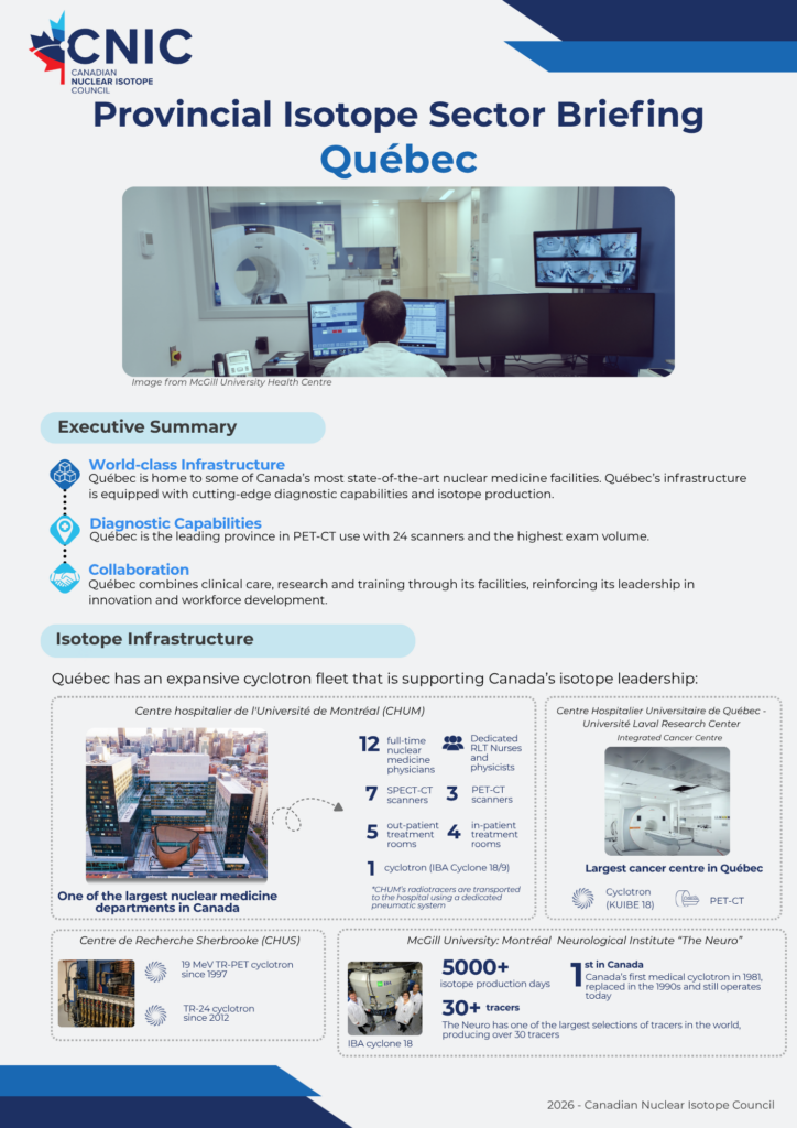 We’re glad to showcase the innovation powering Canada’s isotope ecosystem from coast to coast. These educational resources, developed in partnership with industry, academic, and clinical leaders across the country, provide a detailed overview of the isotope ecosystem within each of Canada’s provinces. Click each page below to open the full briefing.